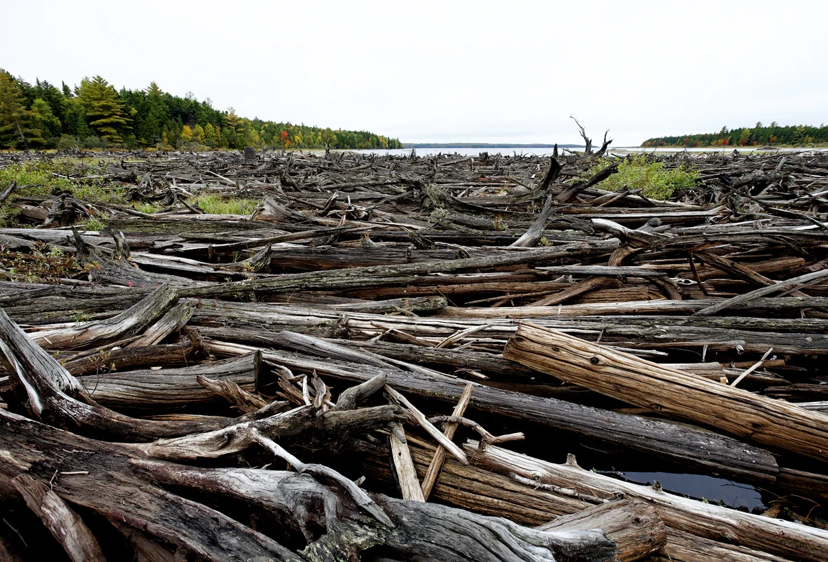 A belt of dead trees stood all around the lake, some far out in the water, with others prostrate behind them, and they made the shore, for the most part, almost inaccessible. This is the effect of the dam at the outlet. Thus the natural sandy or rocky shore, with its green fringe, was concealed and destroyed. We coasted westward along the north side, searching for the outlet, about ¼ of a mile distant from this savage-looking shore, on which the waves were breaking violently, knowing that it might easily be concealed amid this rubbish, or by the over-lapping of the shore. It is remarkable how little these important gates to a lake are blazoned. There is no triumphal arch over the modest inlet or outlet, but at some undistinguished point it trickles in or out through the uninterrupted forest, almost as through a sponge. H. D. Thoreau